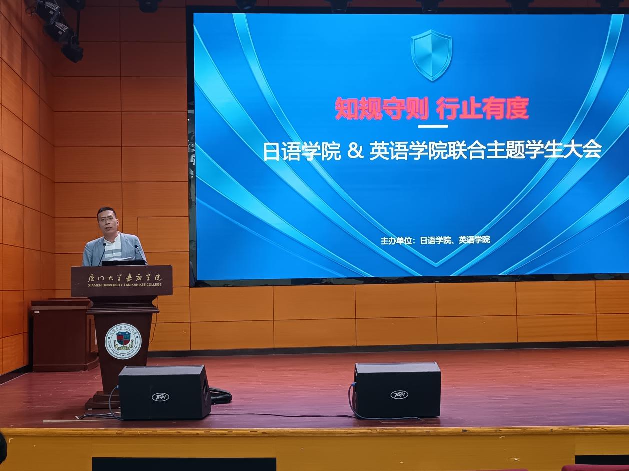 为全面强化学生安全防范意识,规范日常行为准则,筑牢校园安全防线,4 月 2 日中午,日本语言与文化学院、英语语言文化学院于公共教学楼 1 号楼 101 教室,联合召开 “知规守则,行止有度”主题学生大会。
